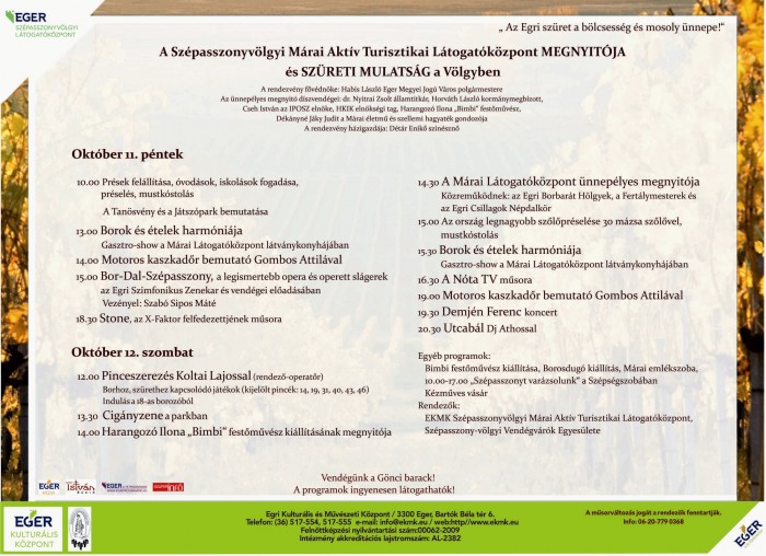 10.00 – Óvodások, iskolások fogadása a völgyben, préselés, mustkóstolás, a Márai Aktív Turisztikai Látogatóközpont projekthez kapcsolódóan elkészült játszópark és tanösvény bemutatása.