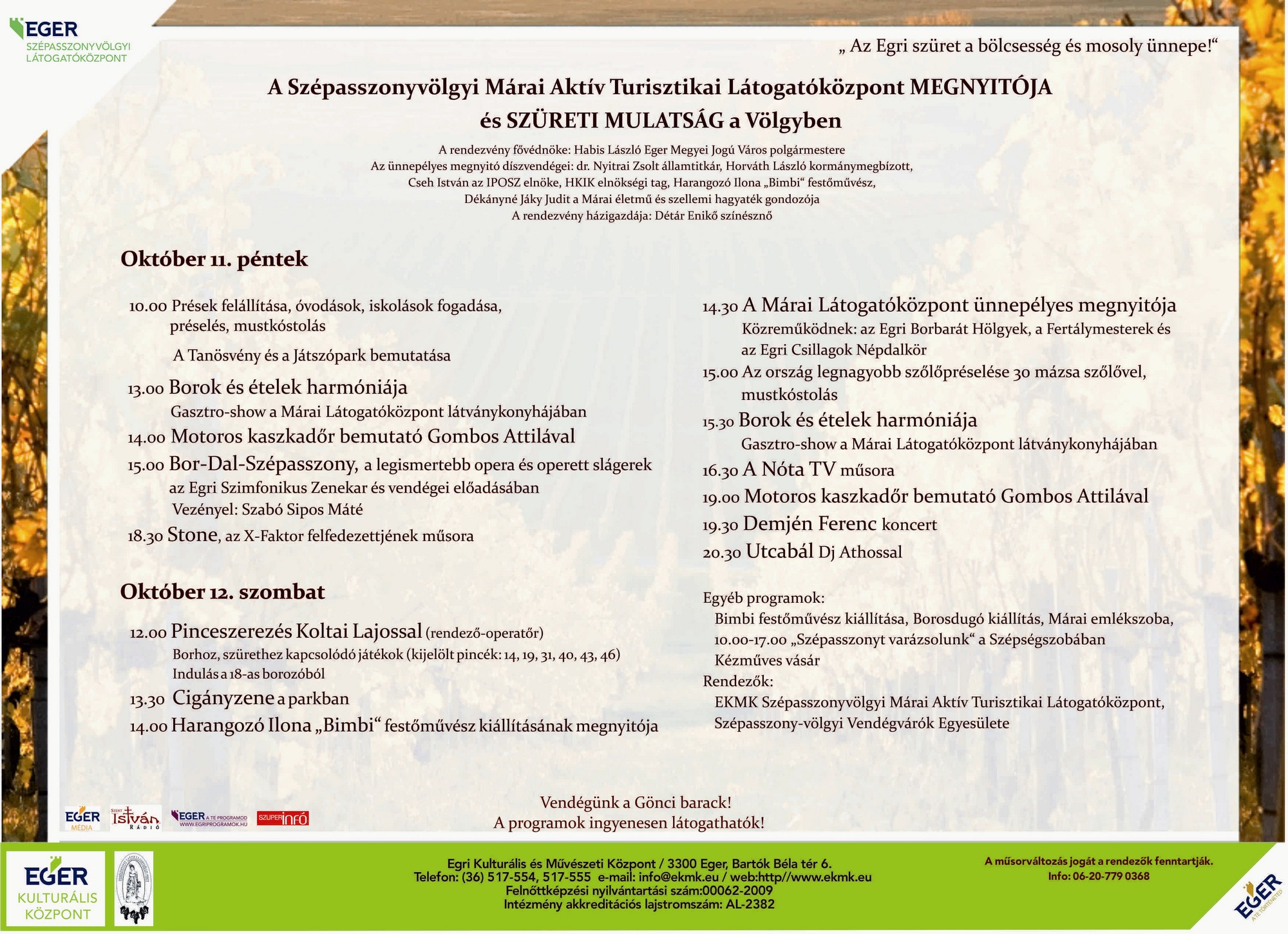 14.30 – Ünnepélyes megnyitó a Márai Látogatóközpontban, Eger polgármestere, Habis László részvételével. Közreműködnek az Egri Borbarát Hölgyek, a Fertálymesterek és az Egri Csillagok Népdalkör.